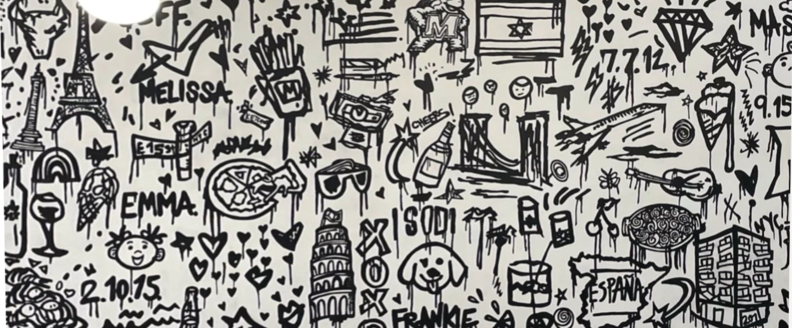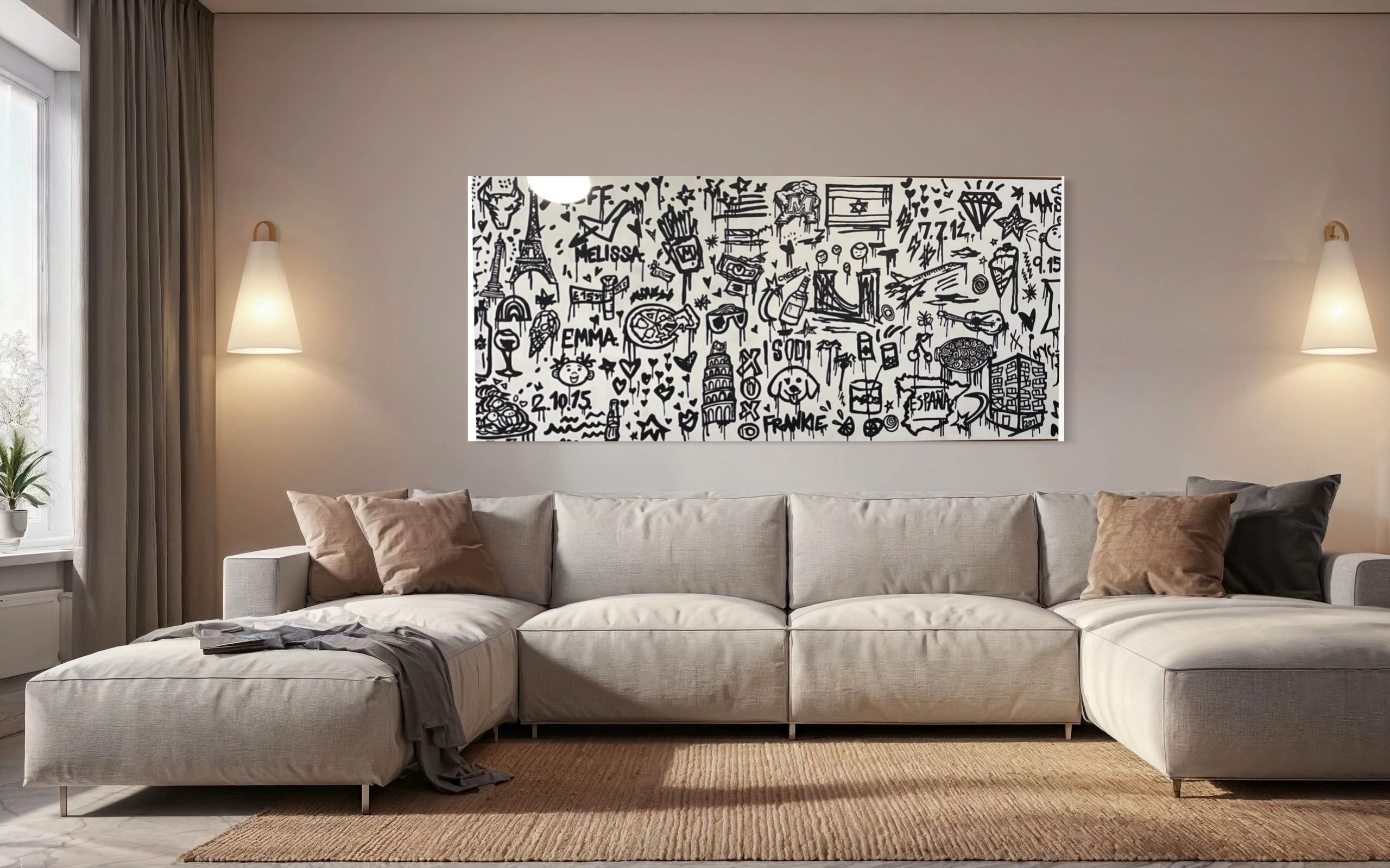Acrylic on canvas.40” x 98“.price includes natural wood frame & the doodles can be customized to clients request. Artist Arlette Tebele Kassin is a ‘Street Pop’ artist currently based in New York. Inspired by street and pop art throughout her life, Arlette’s work oscillates between both styles