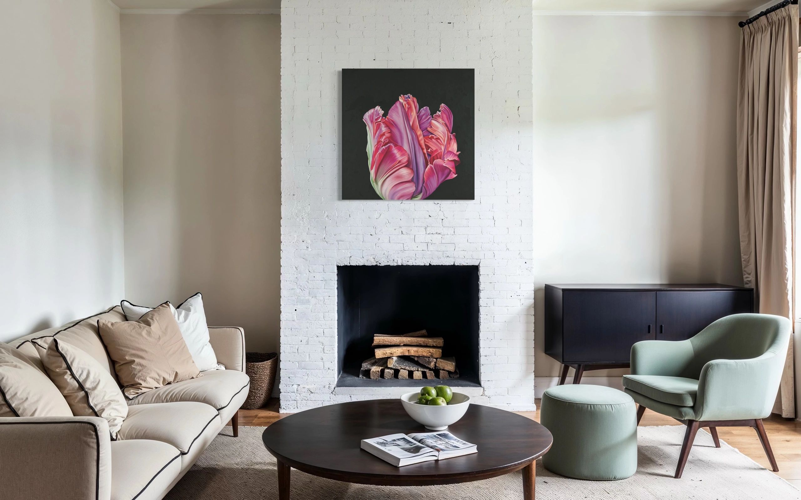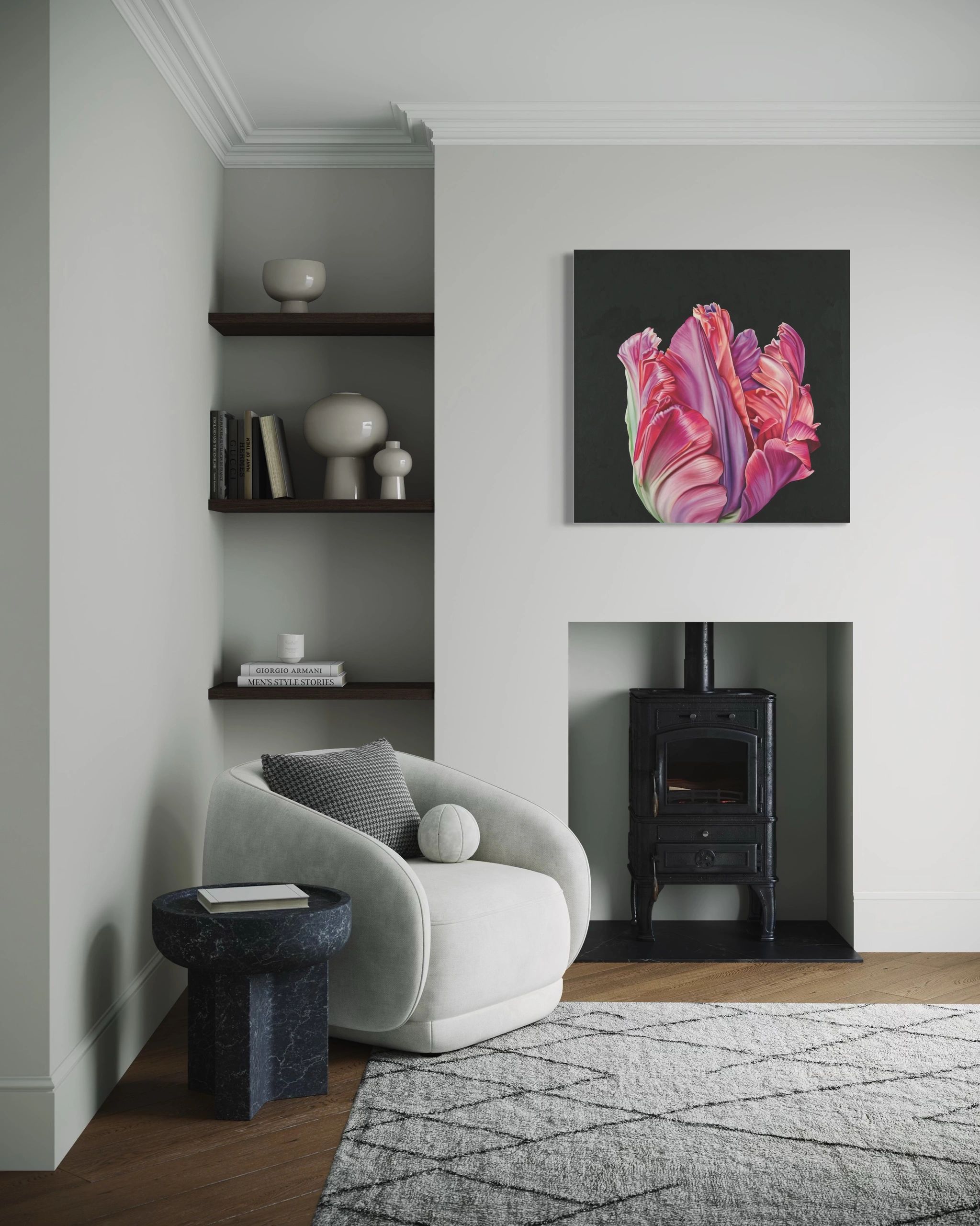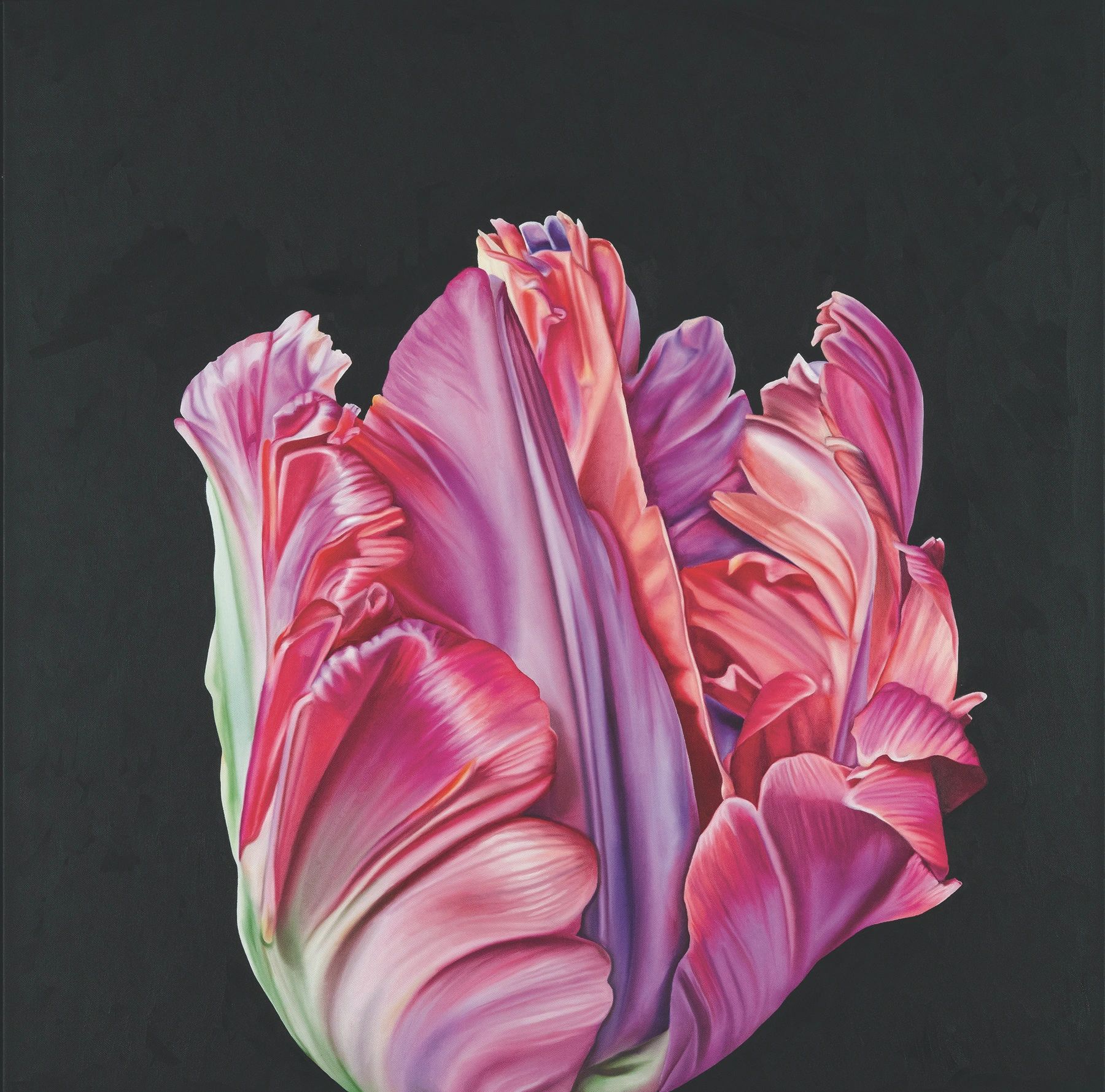 ‘Charlotte’ – a stunning oil on canvas by Liz Green 36″ x 36″ capturing the beauty of a vibrant tulip. Perfect for adding a touch of elegance to any art collection.