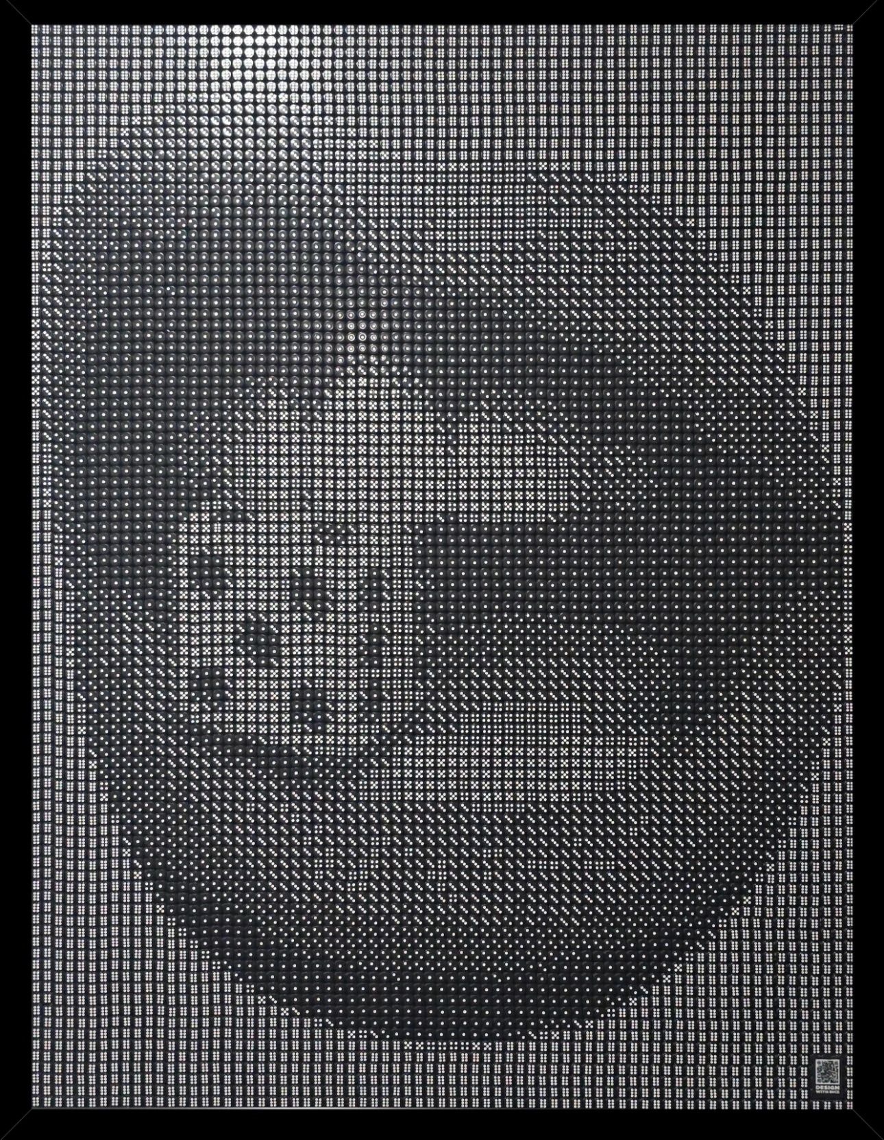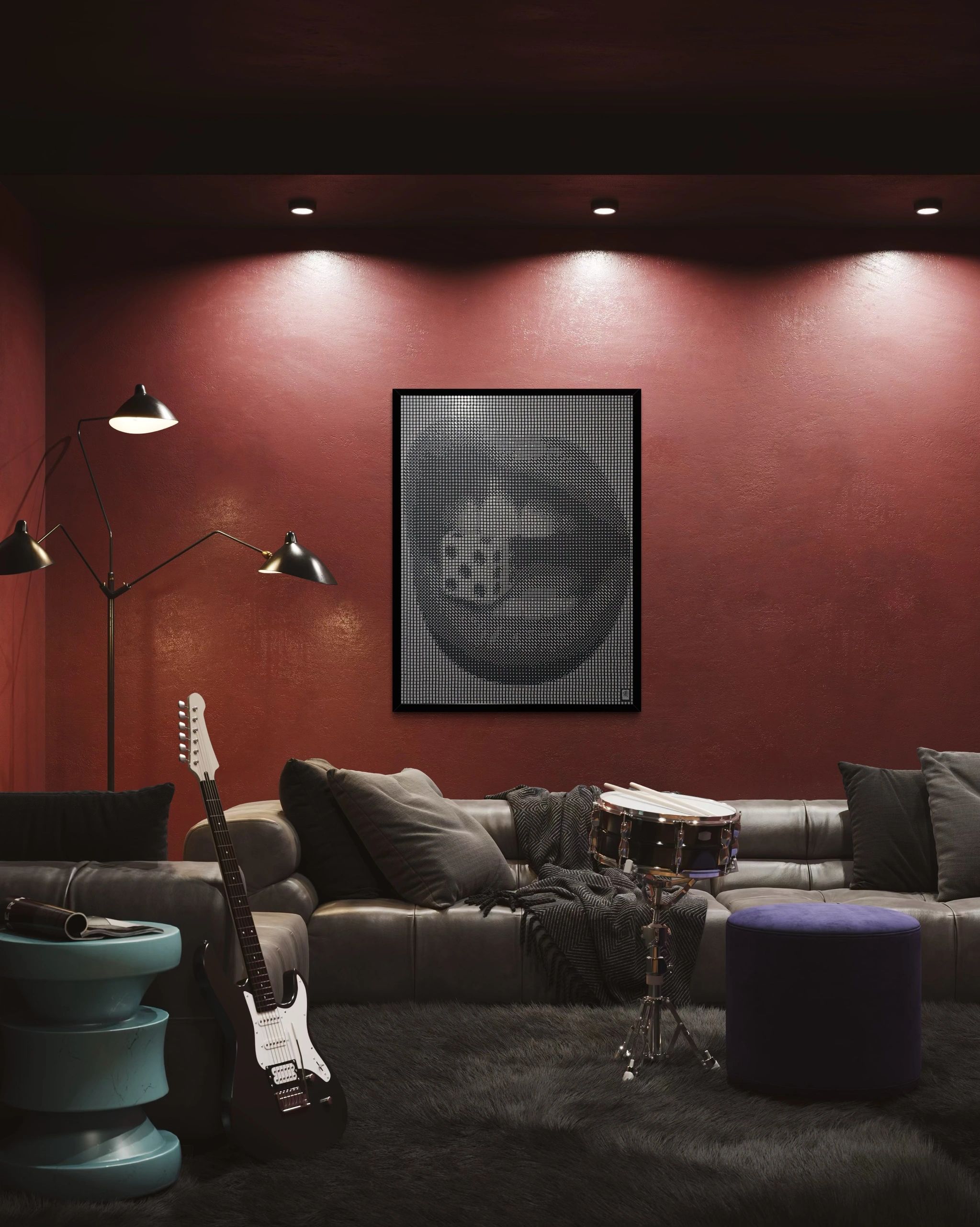 Dice Lips by Johnny Face Off with 7350 dice. 37” x 48” All mosaics are made up of 12mm black/white dice. All Dice are individually placed & glued on 3/4″ plywood. Wrapped in a custom black aluminum frame. 30″ French cleat mounting system. Johnny Face Off (JFO) crafts intricate mosaics using only black and white dice, a reflection of Yin and Yan — opposing forces in perfect balance. It’s where chance meets intention, and thousands of dice converge into a singular vision. Each piece challenges perception, inviting you to embrace mystery, where light and shadow dance in equilibrium. His work is a celebration of the unexpected, precision-built with a touch of the enigmatic.