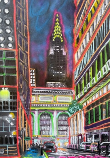A stunning mixed media piece by Jessie Rubin featuring a dramatic nighttime view of the Chrysler Building and Grand Central Terminal. Vivid neon outlines in red, green, and yellow illuminate the iconic Manhattan architecture against a moody sky. Aerosol and oil stick on canvas. 30″ x 40″.
