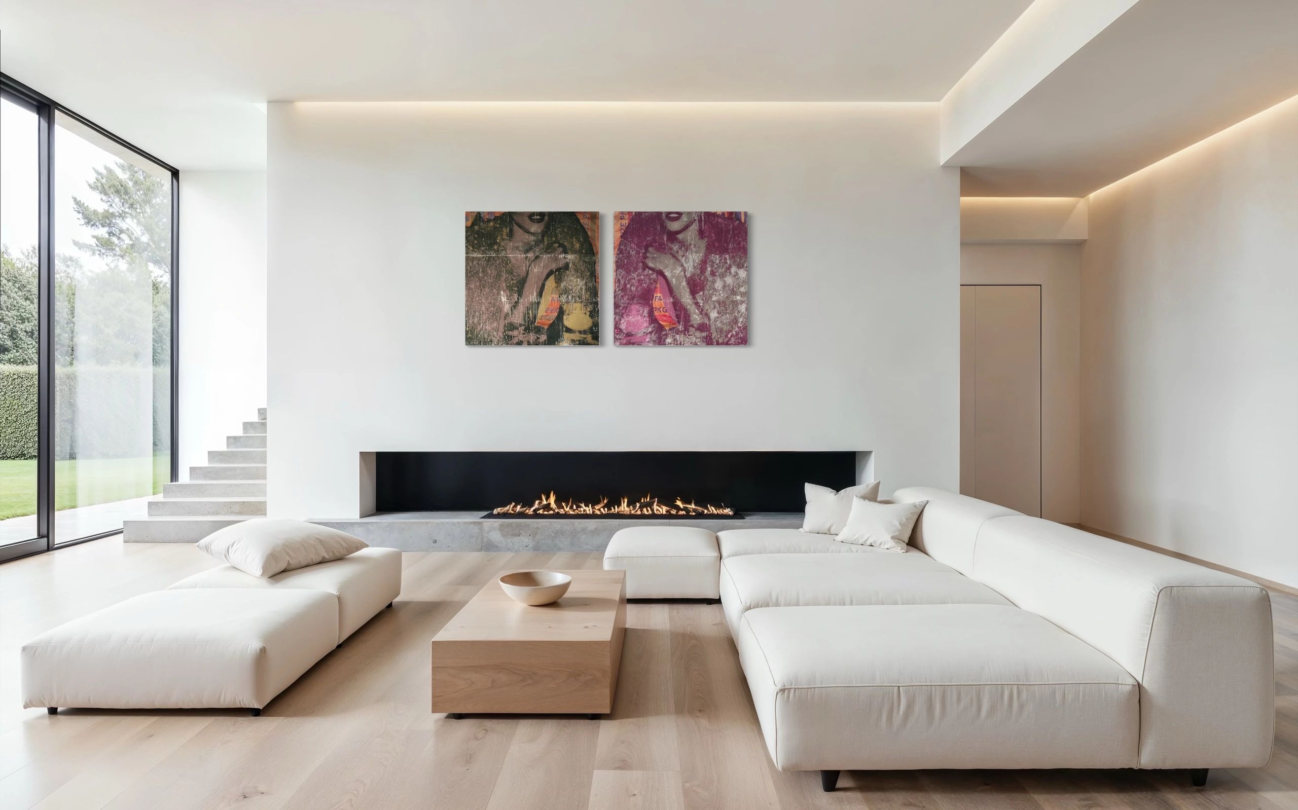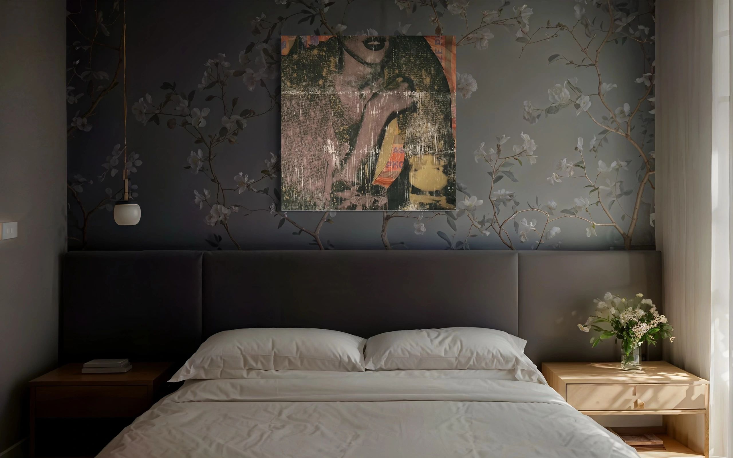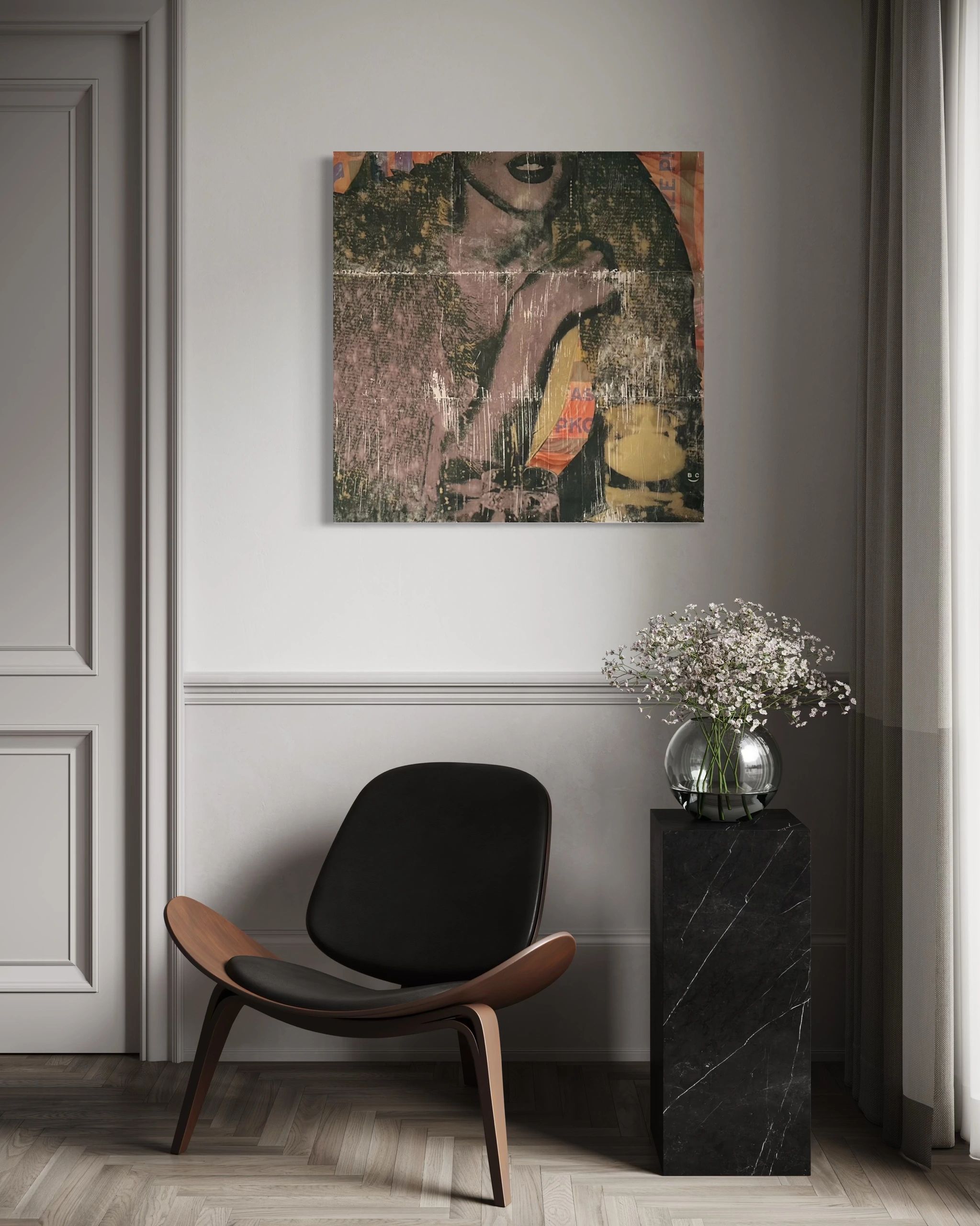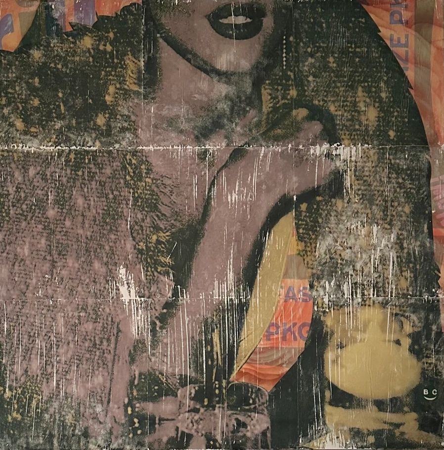 Glamazon Green 36 x 36 ink and gel on canvas by Bryn Craven. A transformative piece using a technique of peeling back paper to reveal intricate designs and motifs in canvas which helped become an integral part of Bryn’s future work.