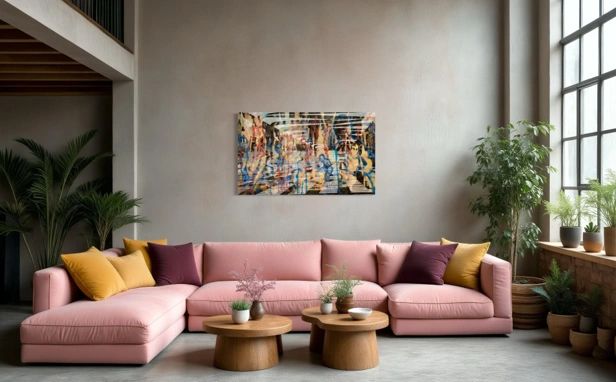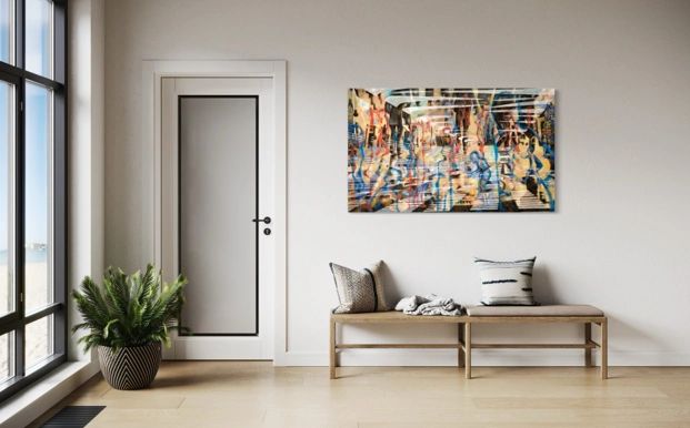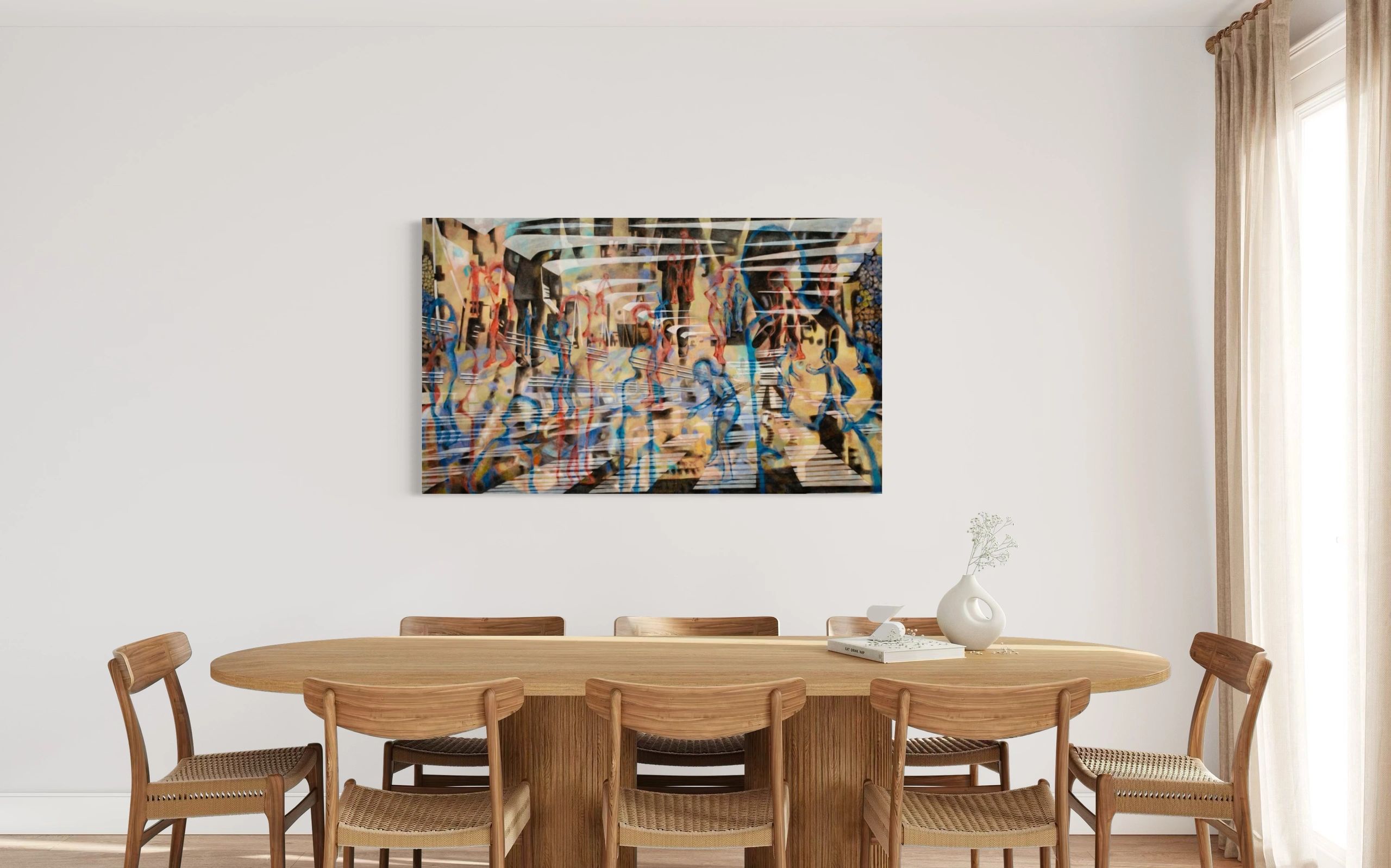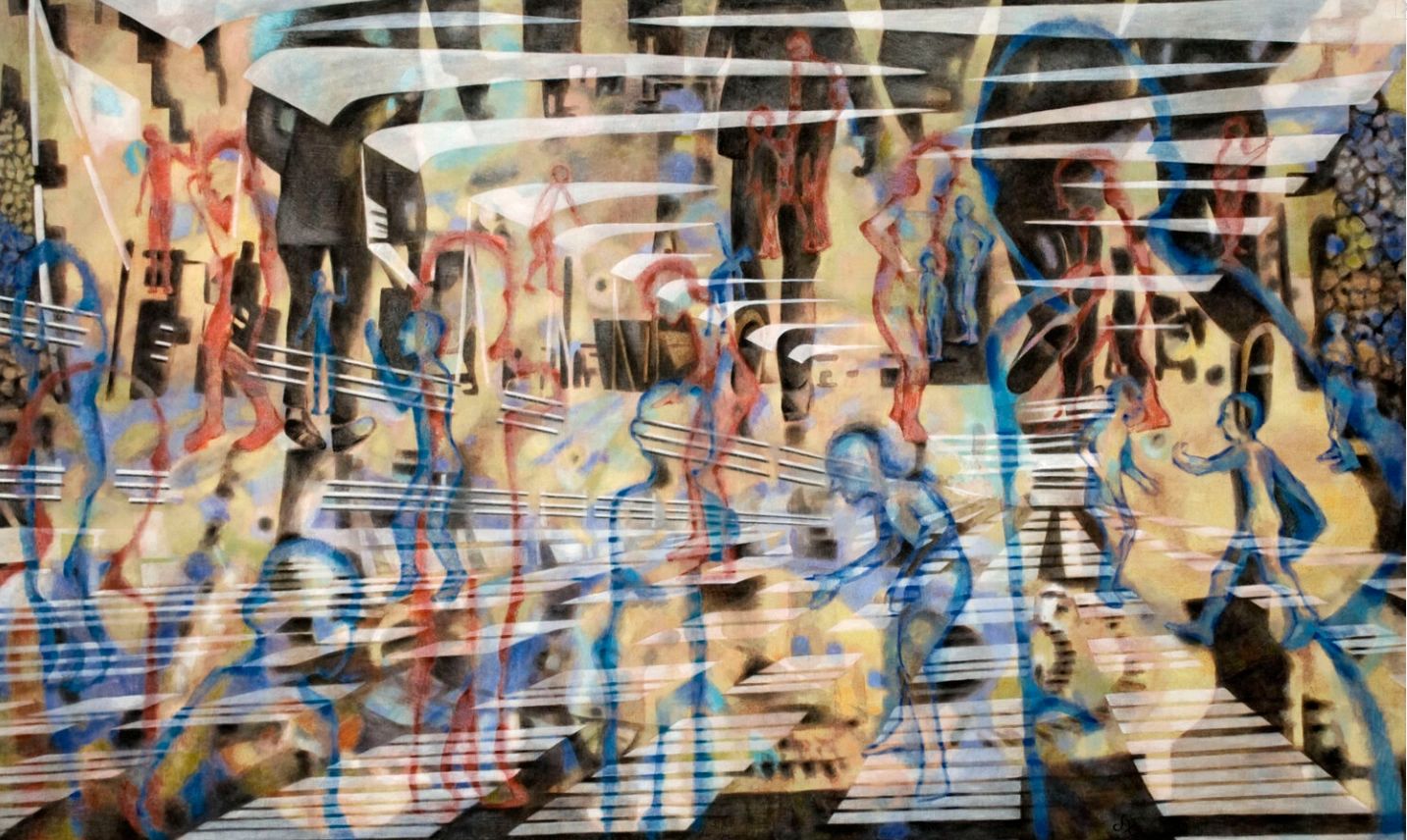 Acrylic and molding paste on canvas. 36″ x 60″ Inspiration and Creative Process: Memento or Good Morning to Myself Sleep is the most unconscious state and the closest we come to nothingness. It is essential for survival and an inescapable part of life. Within this void, dreaming emerges—a journey into the deepest layers of our subconscious. Sometimes, our dreams blur the boundaries between reality and imagination, leaving us unsure of what is real. This painting explores the mystery of sleep and the transition from nothingness to the subconscious. Intersecting and layered spaces create a sense of dimensionality, where reality and abstraction coexist. Silhouetted figures wander aimlessly through this fragmented, multi-layered space, lost in the illogical flow of a dreamscape. Through this work, I seek to capture the enigmatic and intangible experience of dreaming—where the familiar becomes surreal, and meaning is elusive.