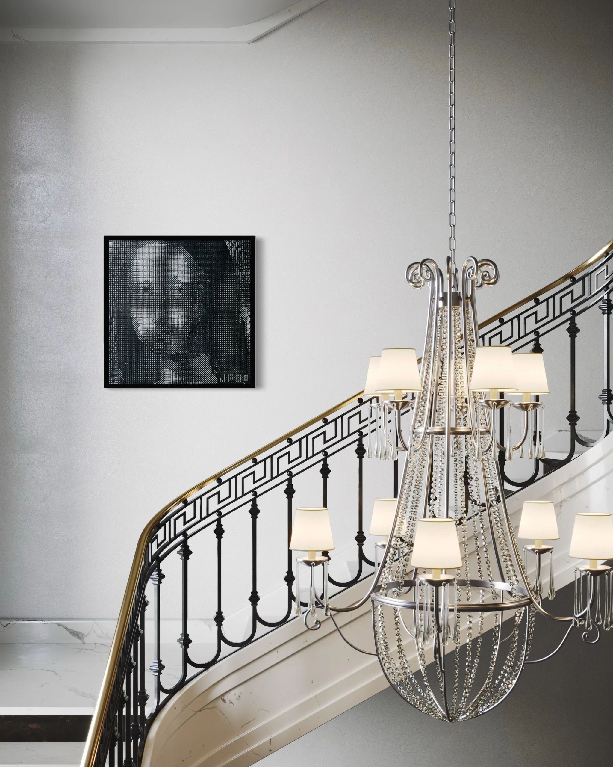 Mona Lisa by Johnny Face Off made with 5625 dice. 37″ x 37″ All mosaics are made up of 12mm black/white dice. All Dice are individually placed & glued on 3/4″ plywood. Wrapped in a custom black aluminum frame. 30″ French cleat mounting system. Johnny Face Off (JFO) crafts intricate mosaics using only black and white dice, a reflection of Yin and Yan — opposing forces in perfect balance. It’s where chance meets intention, and thousands of dice converge into a singular vision. Each piece challenges perception, inviting you to embrace mystery, where light and shadow dance in equilibrium. His work is a celebration of the unexpected, precision-built with a touch of the enigmatic.