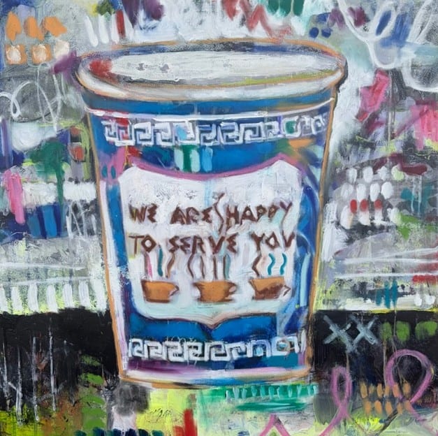 Acrylic, aerosol and oil stick on printed canvas, 30″x40″, 2025