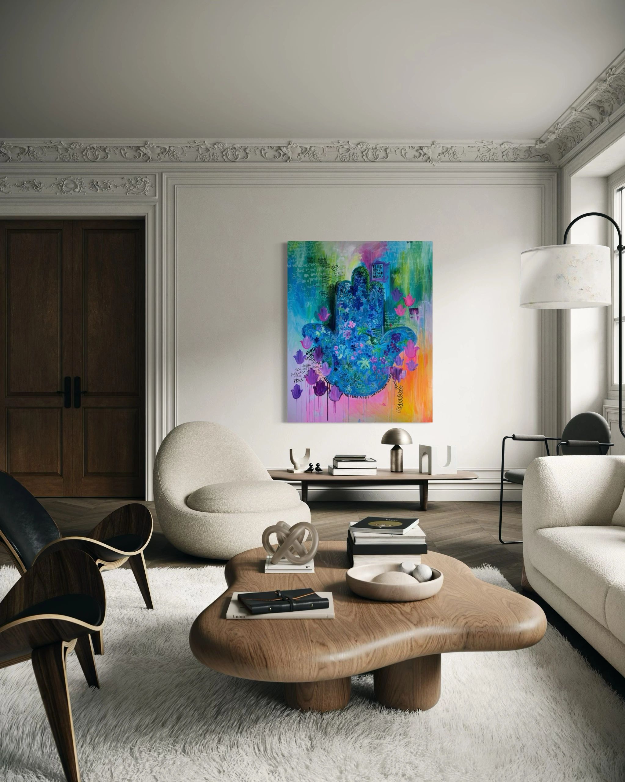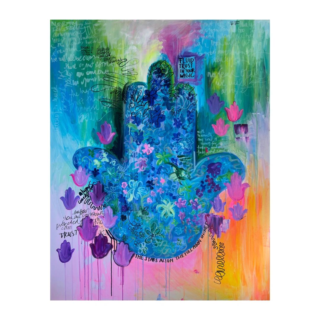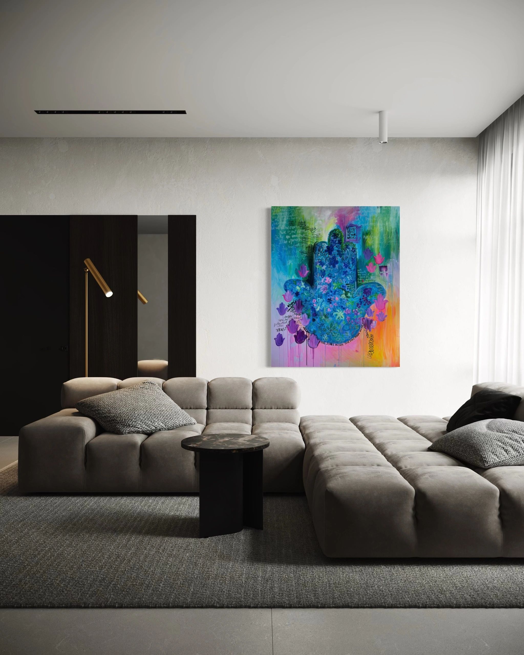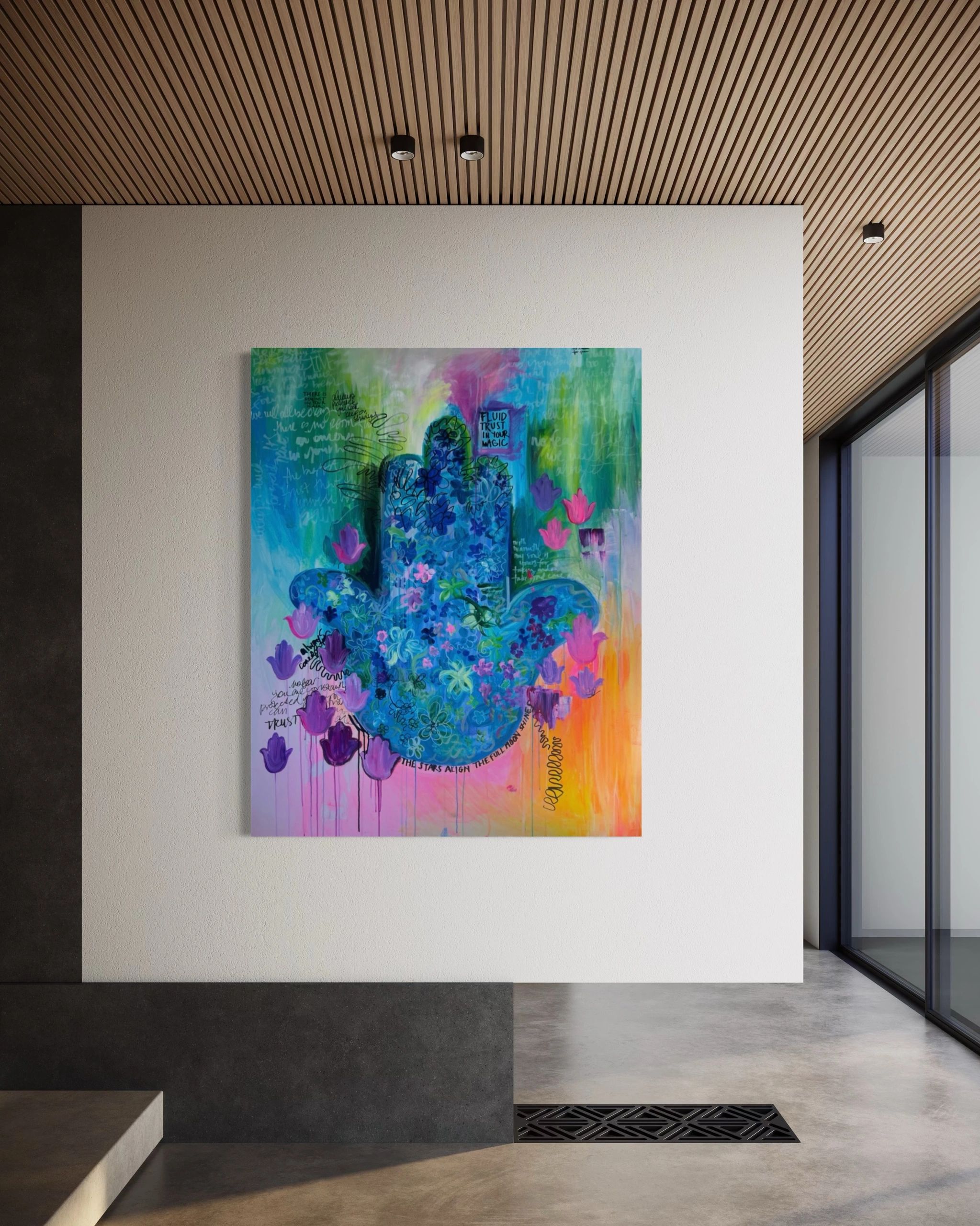 No Fear by Sara Joy. 60″ X48″ acrylic on canvas. “No Fear” is self expression as a Jewish woman and mother, holding onto the grief and worry and anxiety for the world, and hoping for the future of our children. We cannot live afraid to be who we are, we must be bold and continue to love, be loved, and share our joy. “No Fear” is apart of The Sara Joy Simcha Collection. This collection is the bottled up emotion of a post October 7th world, let out on canvas. Simcha means Joy or Celebration, and these paintings are our reminder to keep doing just that. Art to celebrate our heritage, honor generations together through traditions, and bring intentional energy to your home.