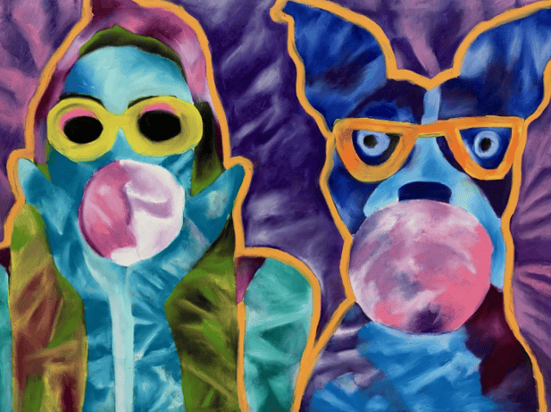 Original acrylic, aerosol and oil stick on printed canvas by Jessie Rubin. 30″x40″.