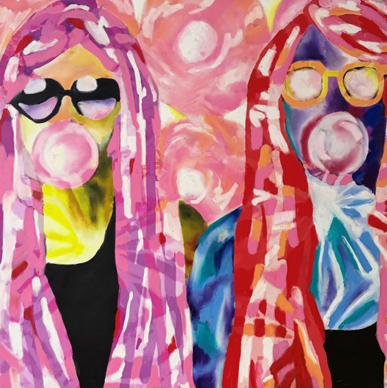 Acrylic, aerosol and oil stick on printed canvas, 36″x36″, 2024