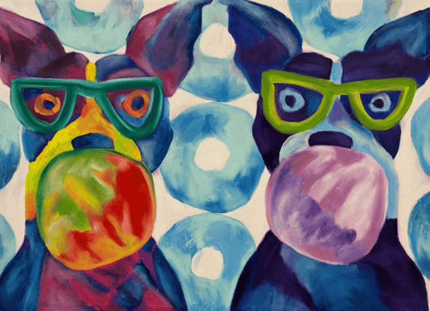 Original acrylic, aerosol and oil stick on printed canvas by Jessie Rubin. 30″x40″.