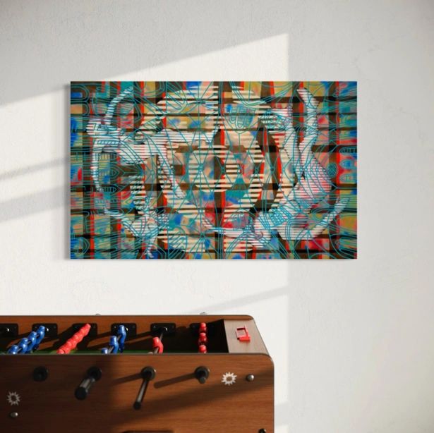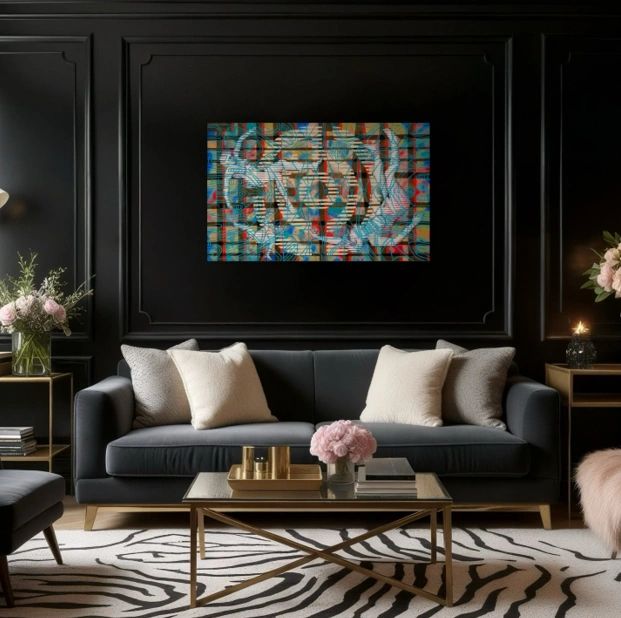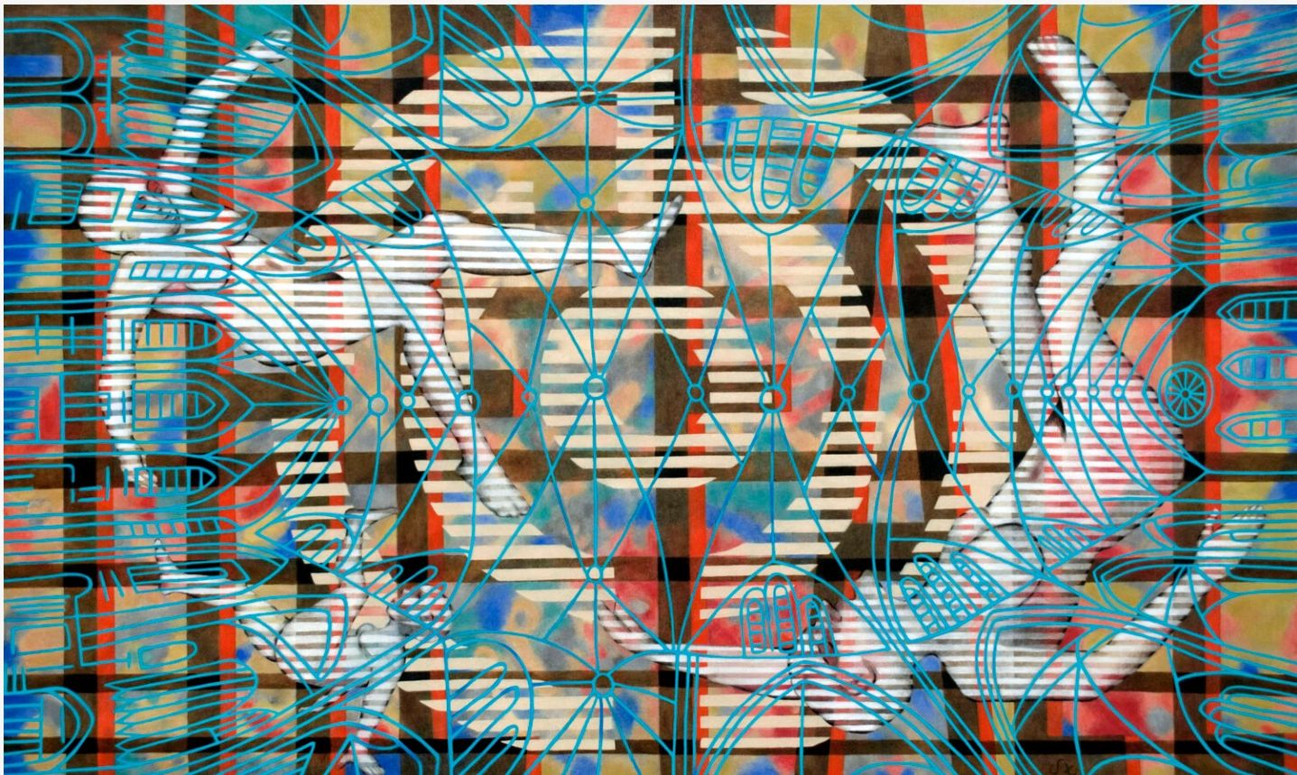 Acrylic and molding past on canvas. 36″ x 60″. Inspiration and Creative Process: The Leap explores the theme of freedom, capturing the pivotal moment when an individual chooses to break free. This concept is symbolized by three figures in free fall, their serene expressions and weightless forms evoking the image of leaves drifting on the wind. Despite the inherent danger of descending into the unknown, the figures embody a profound sense of peace. Their striped bodies evoke prison uniforms, signifying the constraints they are leaving behind. In the background, the disguised words “THE FALL” form a subtle, gridded pattern, adding layers of meaning to the composition. Superimposed over the figures is a stylized ribbed vaulted cathedral ceiling, its windows resembling the bars of a birdcage. This architectural element represents the institutional structures that often confine us. The painting reflects the courage required to embrace transformative change, portraying the leap into uncertainty as both a perilous and liberating act of human will.