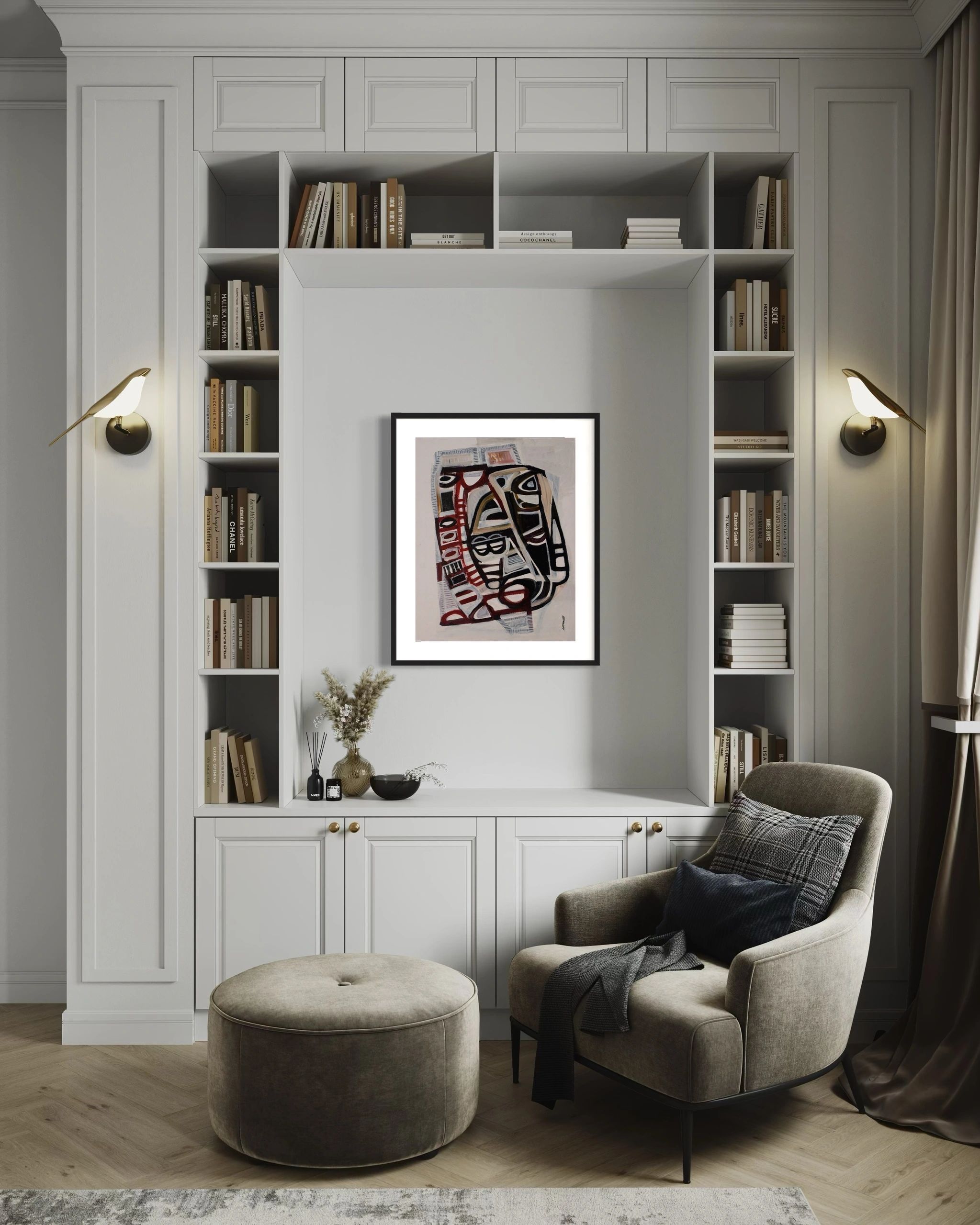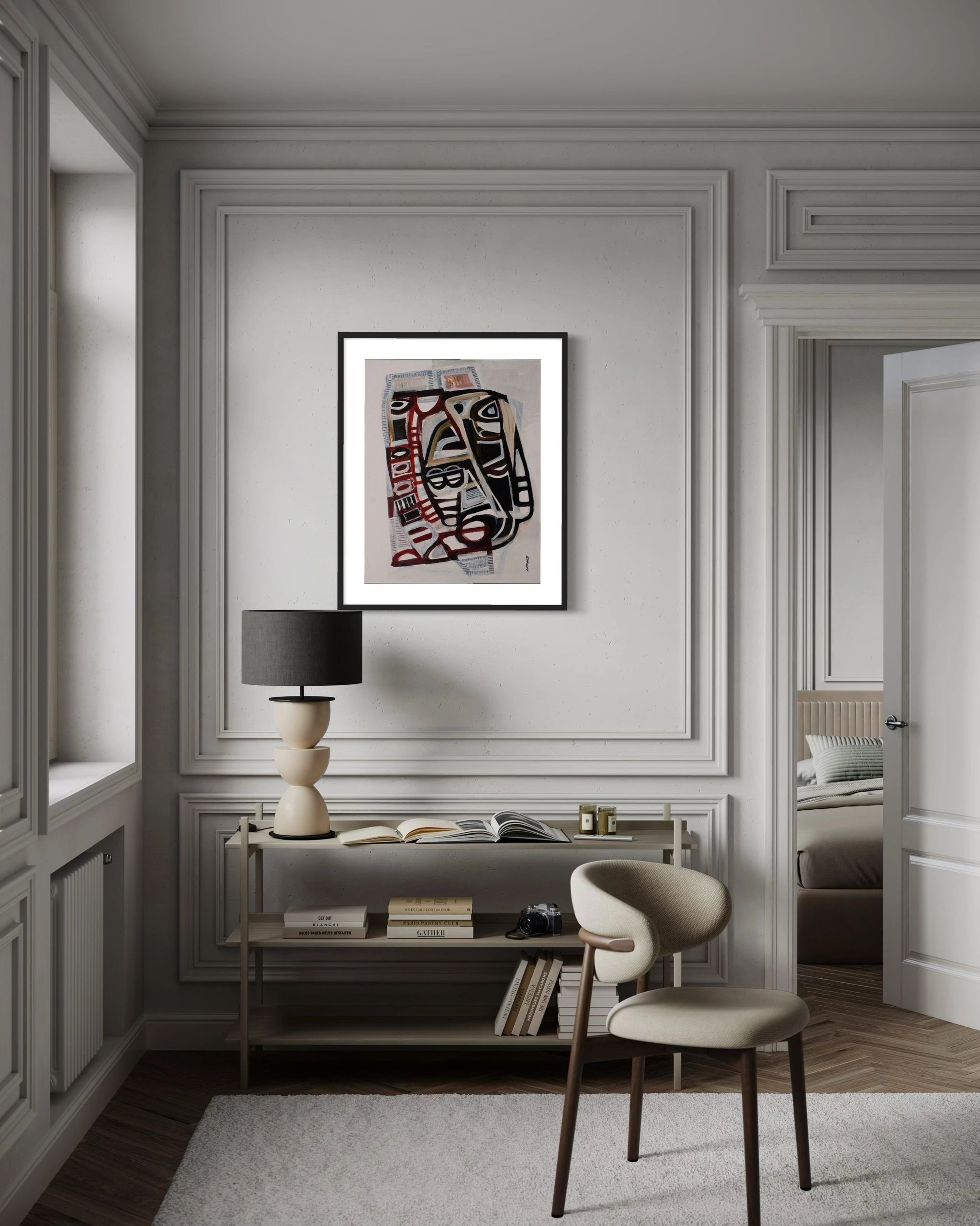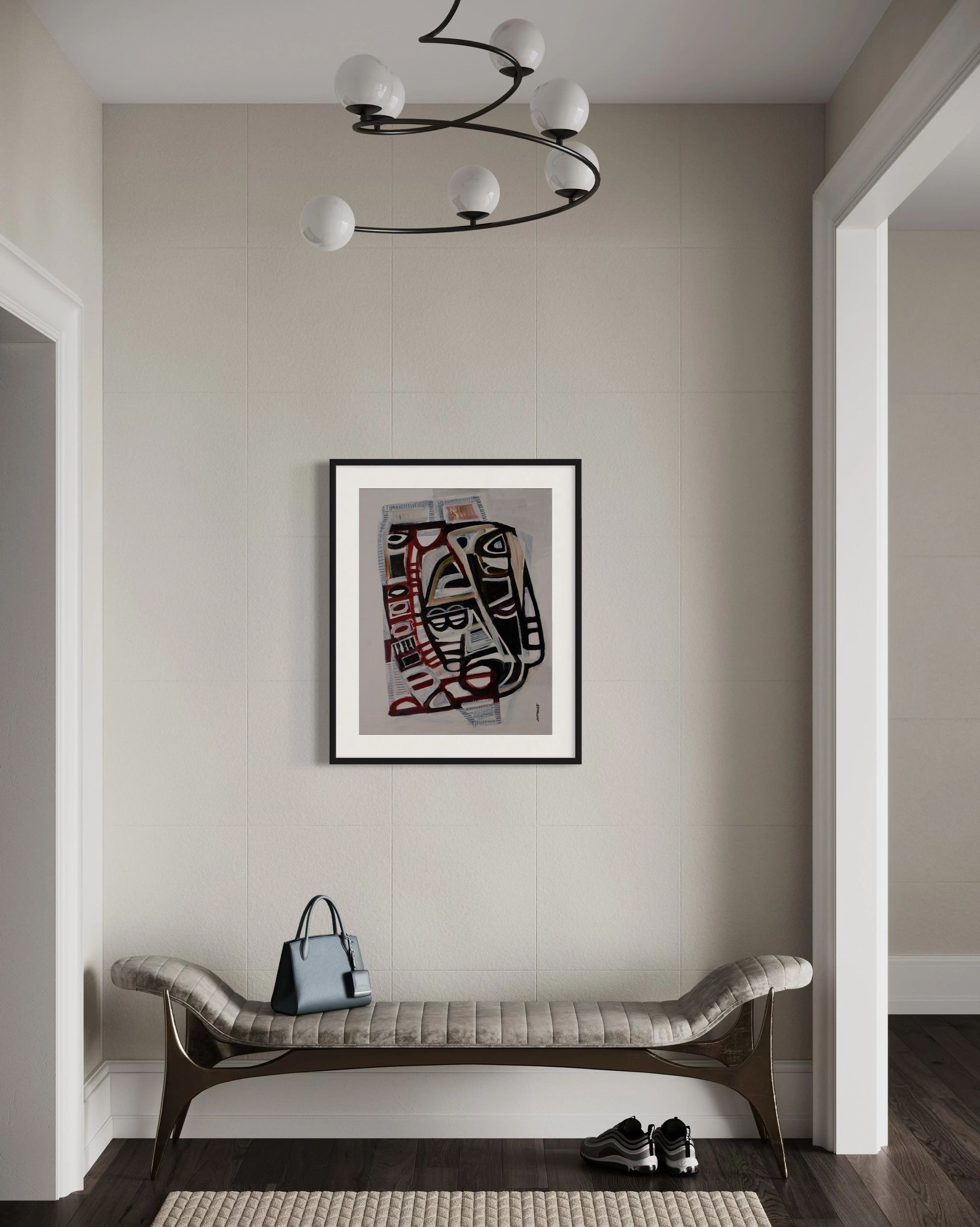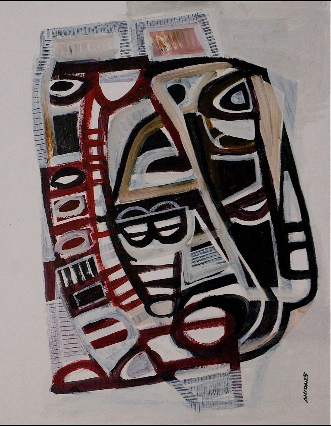 Anton Modern Art 28” x 22” mixed media on paper. Anton is a contemporary mixed-media artist whose bold, vibrant work is inspired by African tribal art. He blends geometric shapes, rich color, and raw, fractured figures to spark personal interpretation.