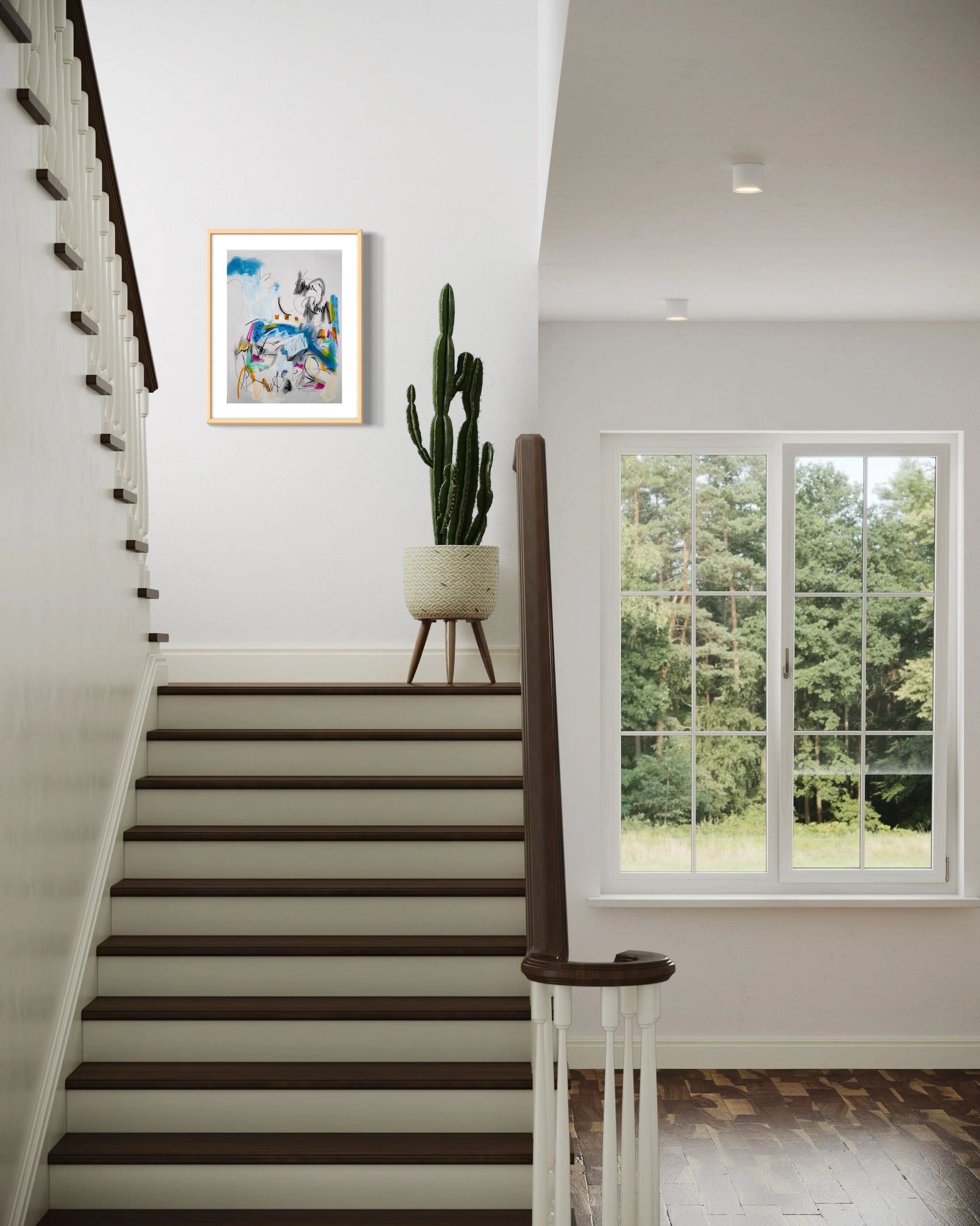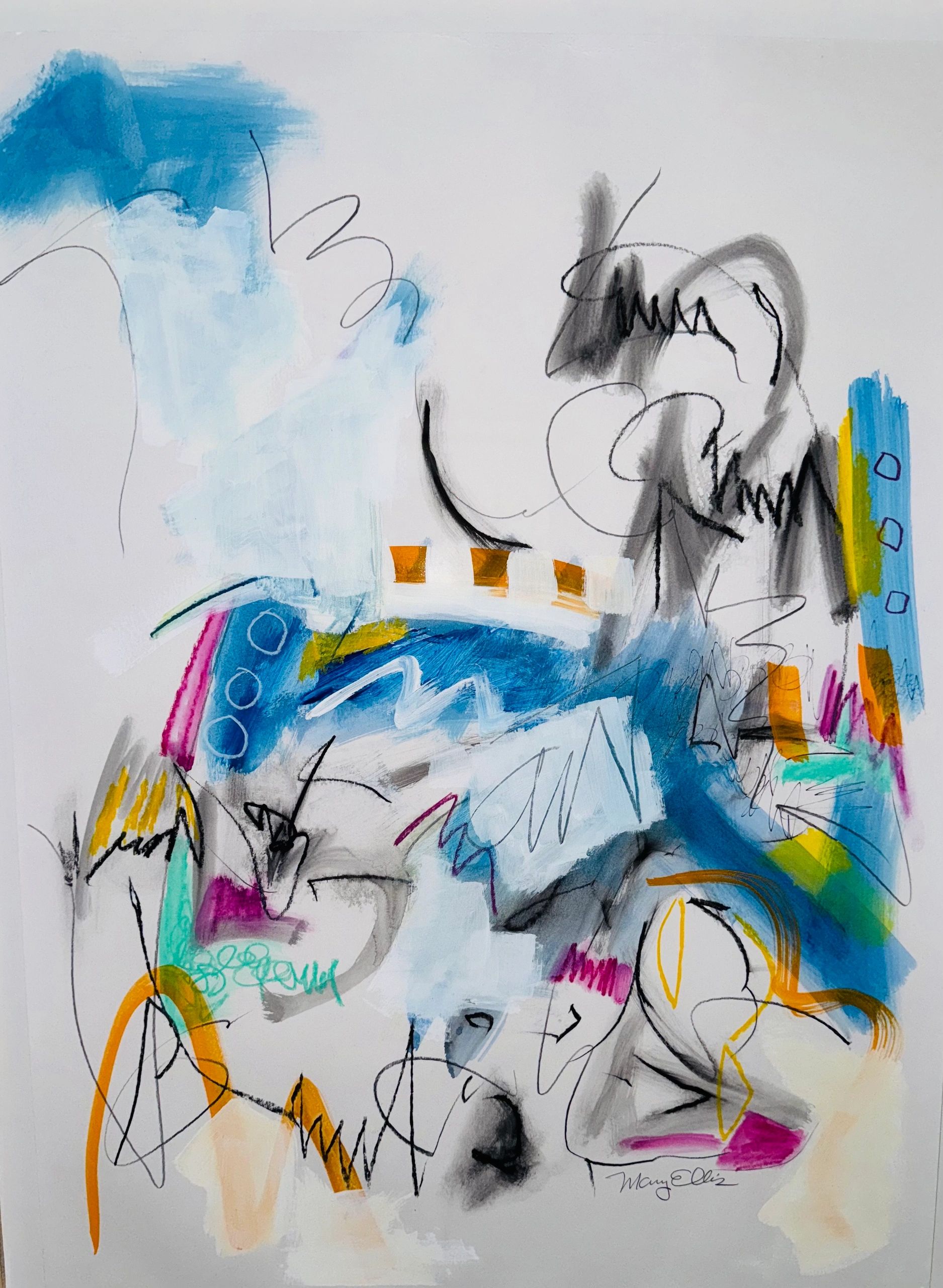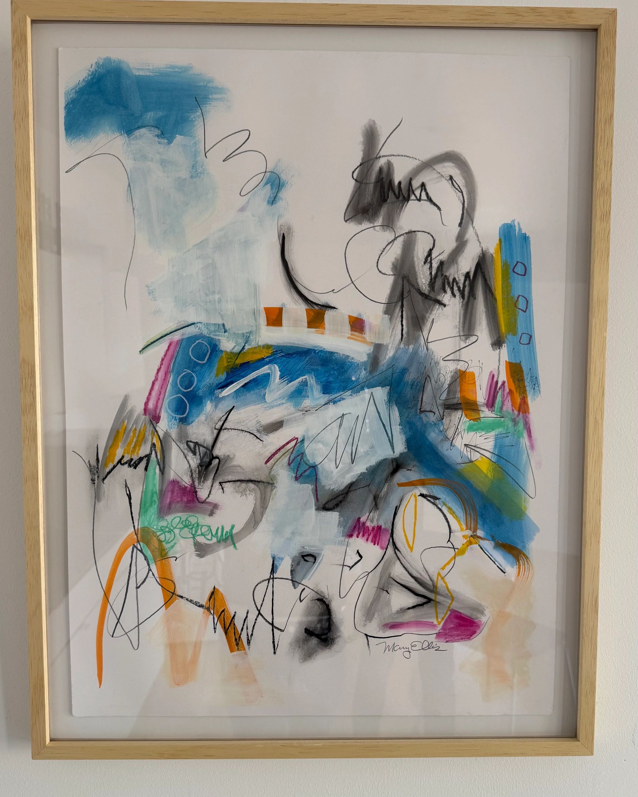Where did you come from 2. Mixed media on archival paper. 21″ x 27″ framed. Work by Artist Mary Ellis. An abstract expressionist painter most known for her successful souvenir brand creating her iconic Pop art designs. This is one of her more recent pieces. She has unlocked a new depth in her work and is embracing her inner voice and exploring the limitless possibilities of her lifelong passion in art.