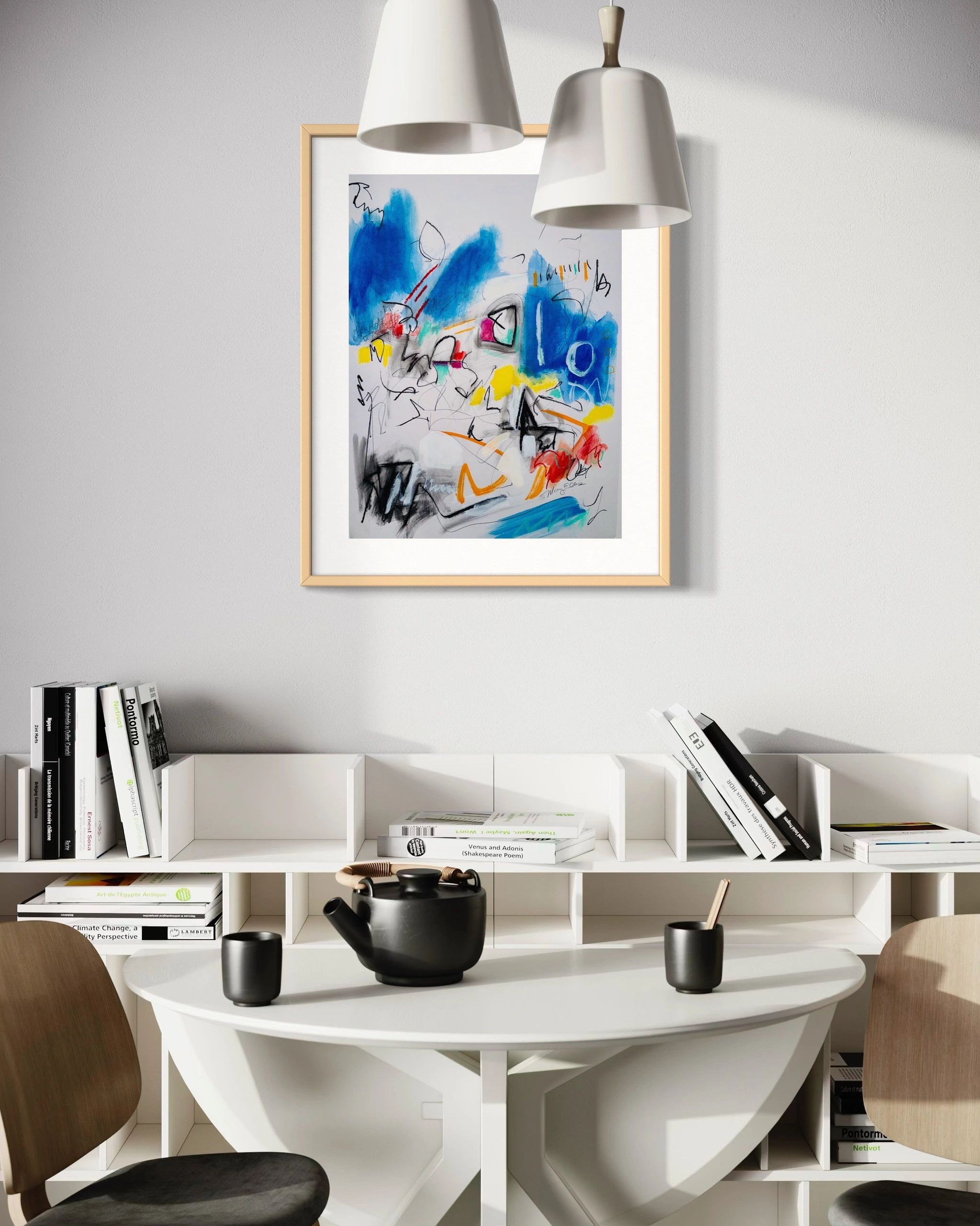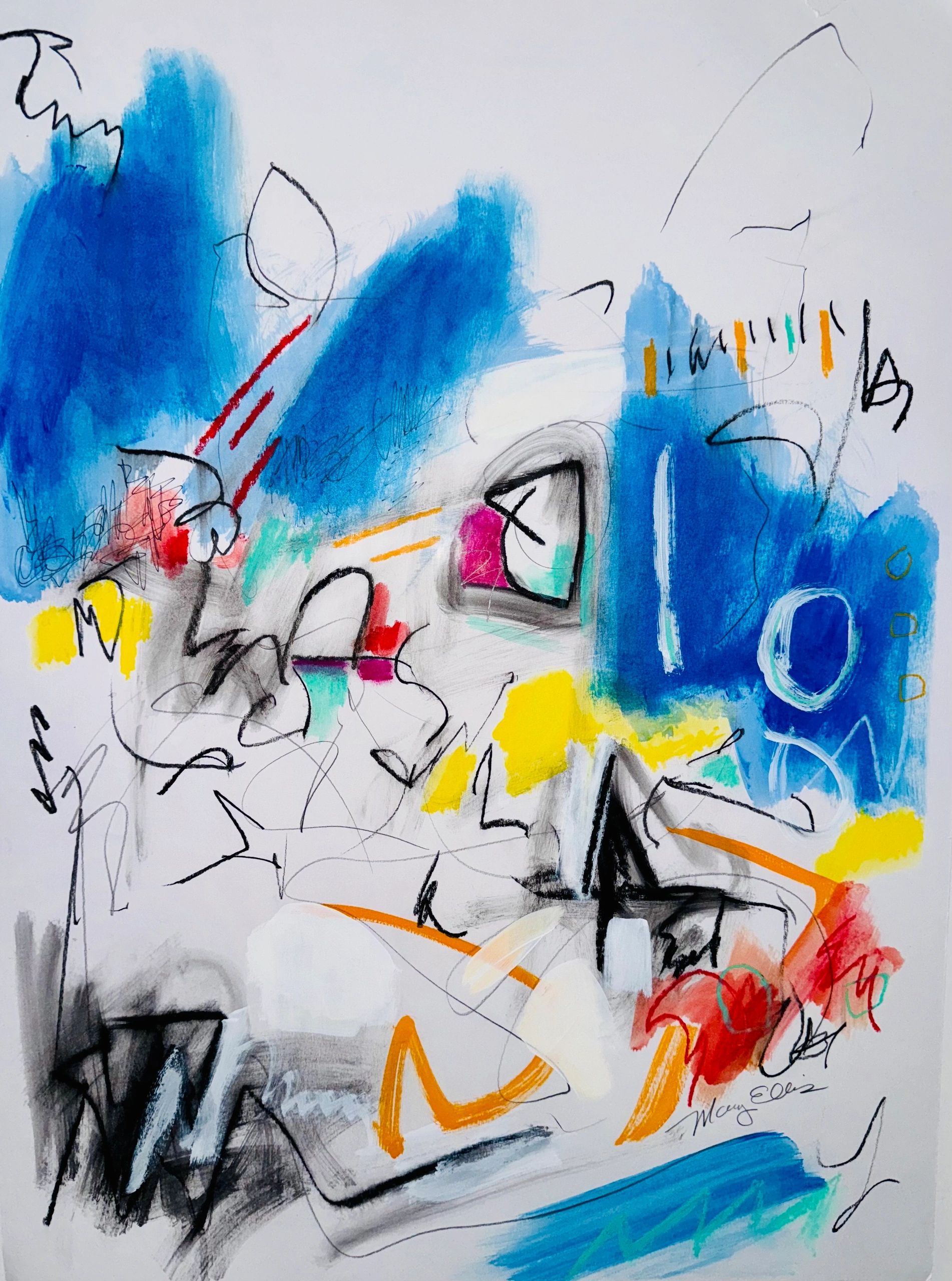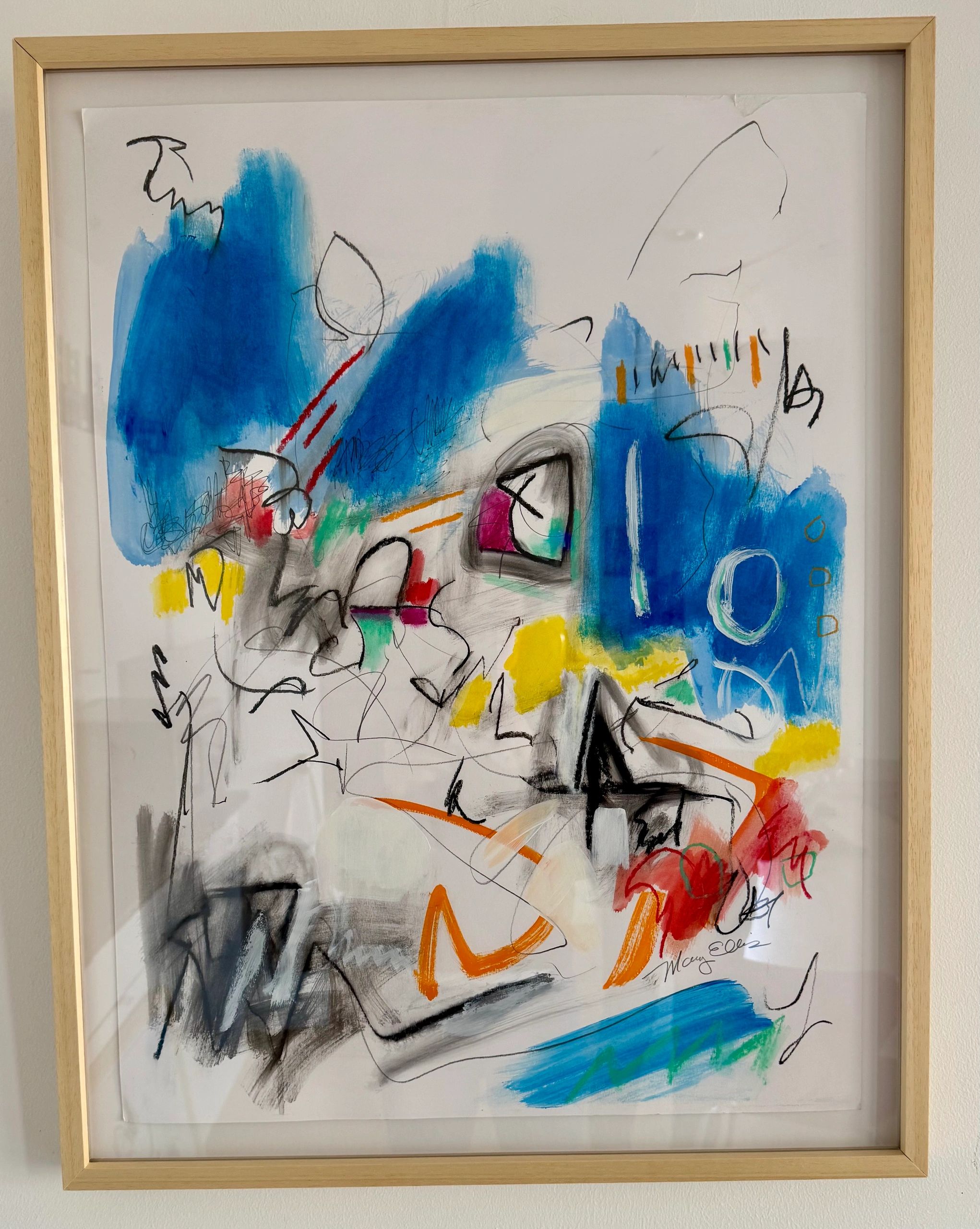 Where did you come from 3. Mixed media on archival paper. 21″ x 27″. framed Work by Artist Mary Ellis. An abstract expressionist painter most known for her successful souvenir brand creating her iconic Pop art designs. This is one of her more recent pieces. She has unlocked a new depth in her work and is embracing her inner voice and exploring the limitless possibilities of her lifelong passion in art.