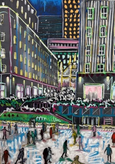 Original mixed media by Jessie Rubin. A vibrant nighttime cityscape capturing the magic and energy of New York City. Aerosol and oil stick on canvas. 30″ x 40″.